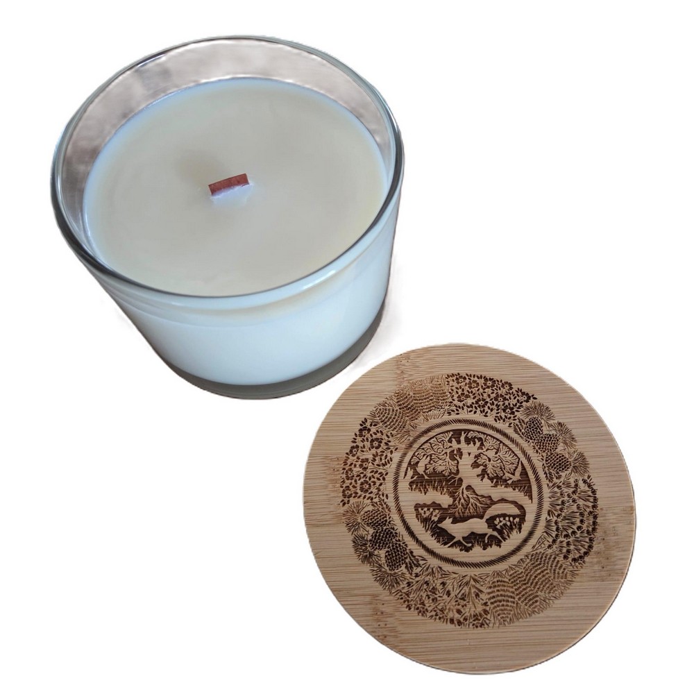 - Pot en verre givré (largeur 10cm) avec couvercle en bois gravé - découpage gravé à choix